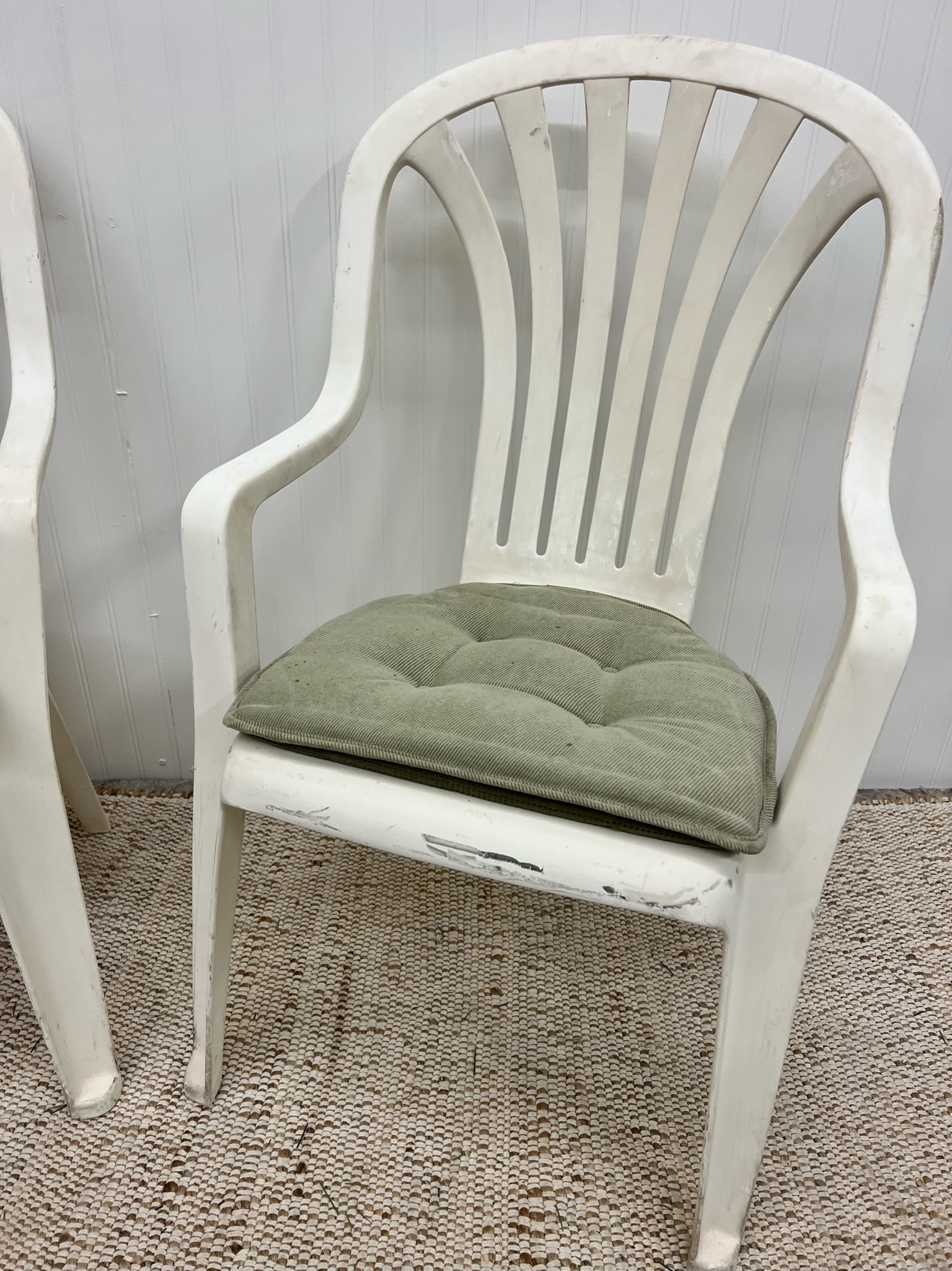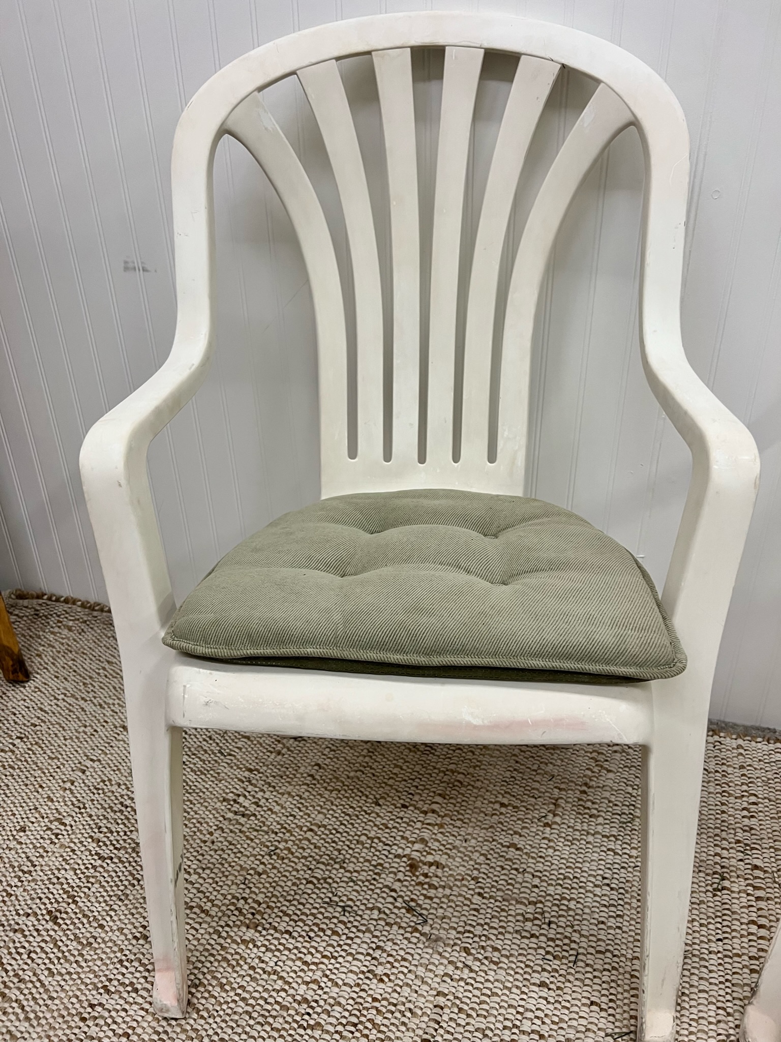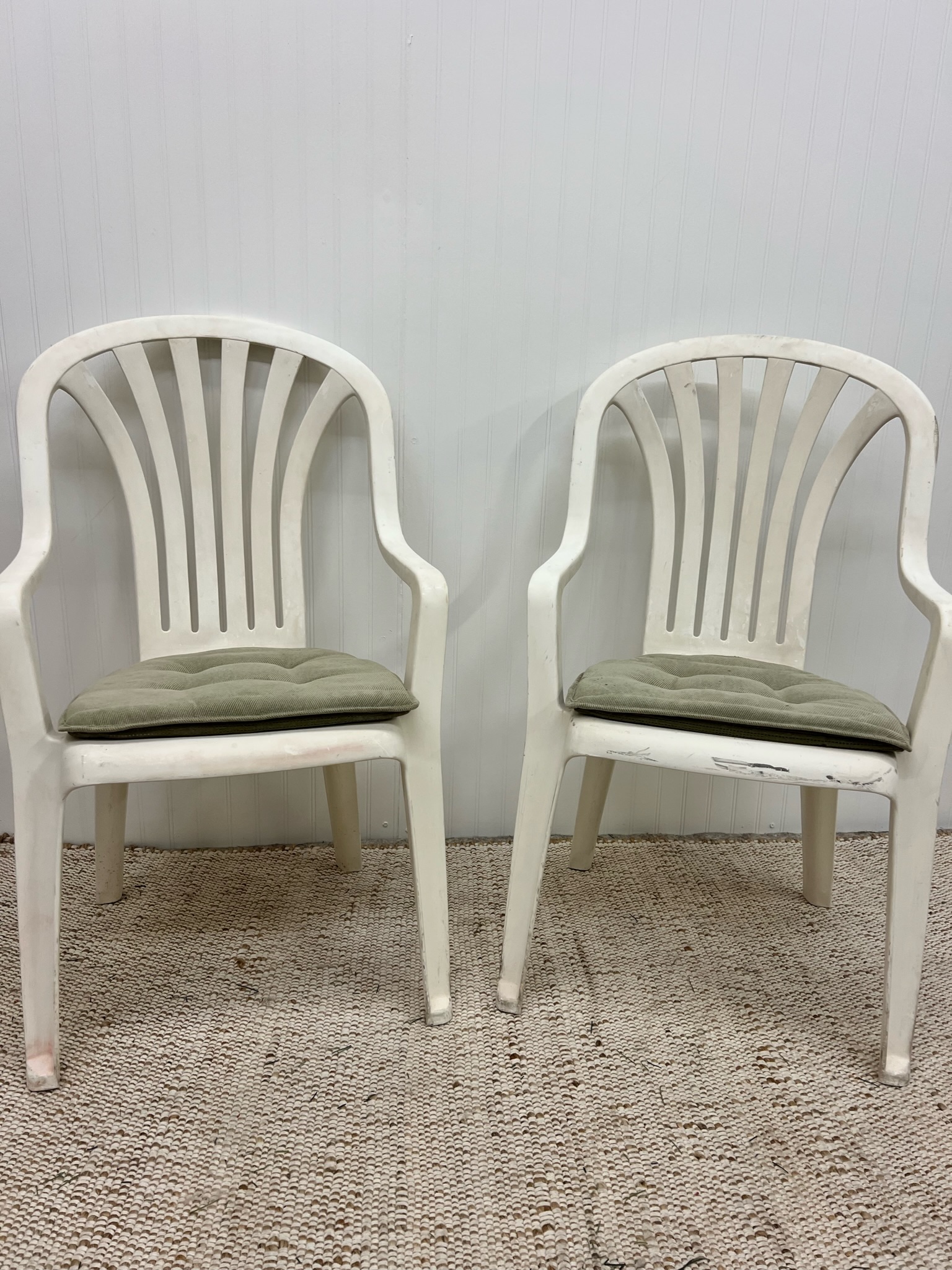 (2) Cushioned Plastic Patio Chairs – These chairs are in good condition overall, has signs of regular use. There are no cracks or breaks in the plastic.